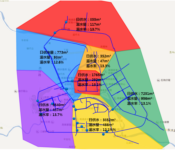 福光水務供水管網漏損管理系統基于DMA (District Metering Area,獨立分區計量)漏損管理技術,結合水司產銷差管理工作需求和管網結構特點,對目標區域進行分區規劃設計,通過評估篩選出漏水問題突出的區域進行重點管控,有針對性的逐步降低管網產銷差,并長期納入平臺監控以維持在低水平。