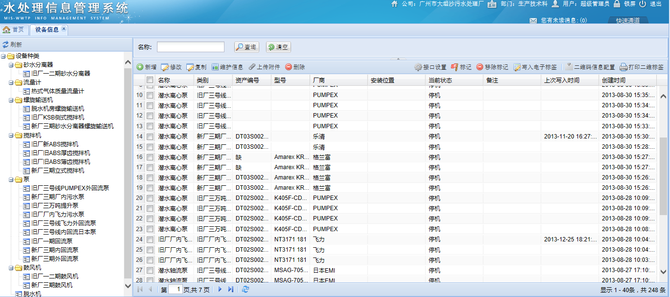 通過對自來水廠、污水處理廠、各級泵站等各類設備進行全生命周期管理,滿足管理人員對設備的采購、使用、封存、保養、運行、巡檢、維修、報廢等過程的管理需求,實施設備狀態跟蹤,自動集成設備的全過程數據記錄,隨時掌握設備使用狀況和技術狀態,保障設備的正常運行,有效降低設備故障率,降低成本消耗,取得最大經濟效益。