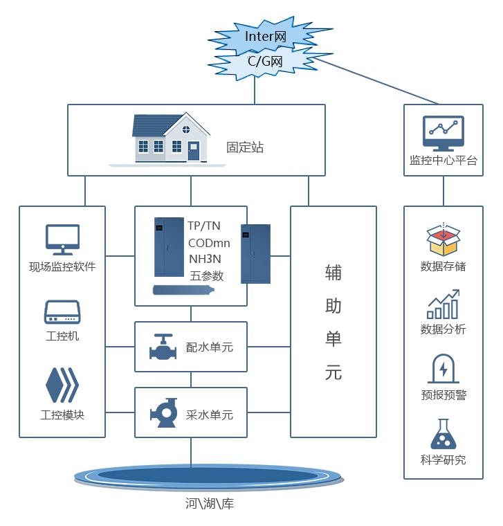 站房式水質自動監測站是設立在湖泊、水庫、飲用水源地,河流等流域內的現場水質自動監測實驗室,是一個把多項水質監測分析儀表組合到一起,結合相應的軟件,達到控制取水,過濾,沉砂,清洗以及儀表分析,數據存儲,數據傳輸等組成的實時監控系統。系統具備遠程控制,數據整理,超標記錄,停電保護及來電自動恢復等功能。達到掌握水質和污染物通量,防治水污染事故,為環境保護管理部門提供技術服務的目的。